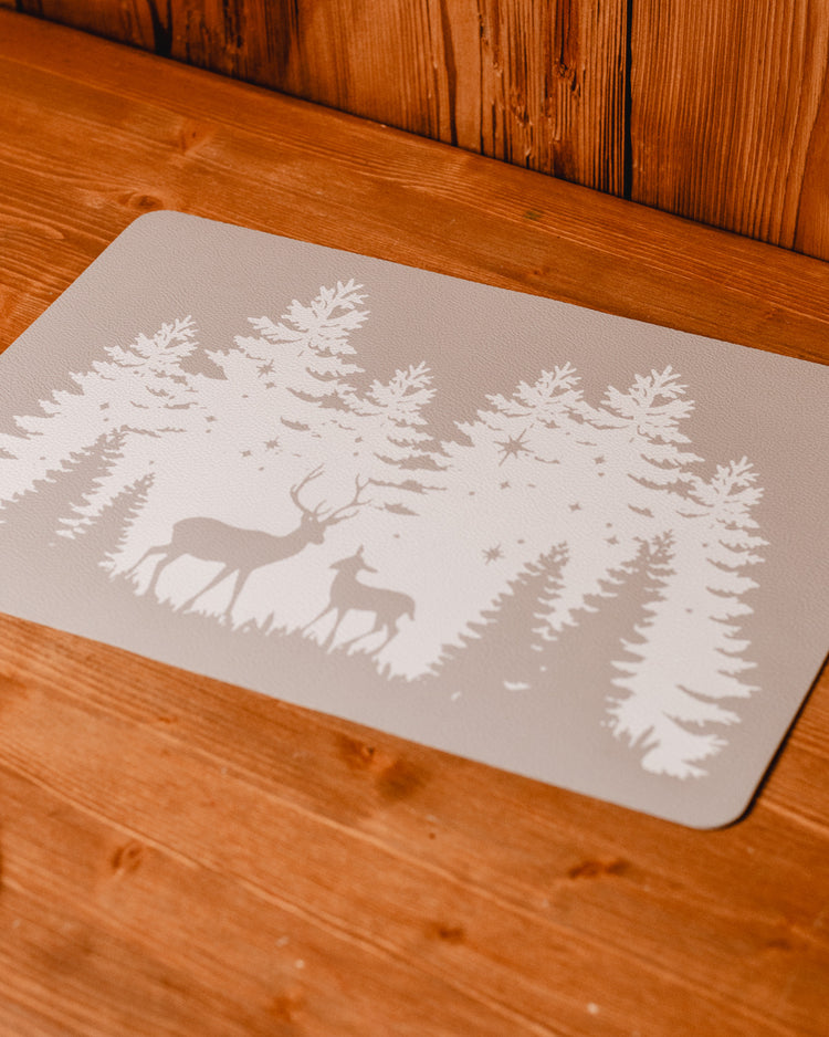 Tovaglietta in vinile grigio con disegno di una foresta a contrasto.