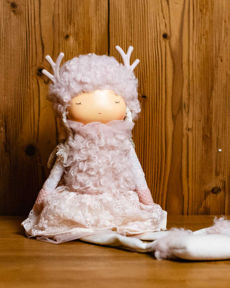 Bambolina con struttura rigida, vestitino in pizzo e pellicciotta.