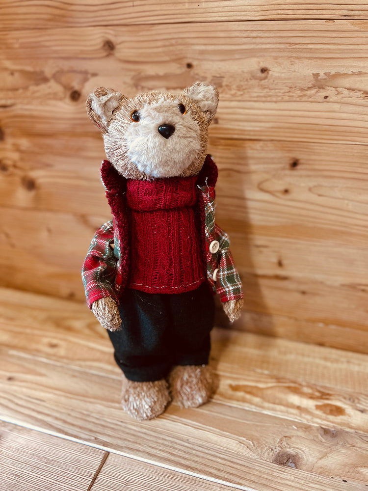 Orsetti rigidi che stanno in piedi rivestiti con la paglia e decorati con abiti in tessuto.