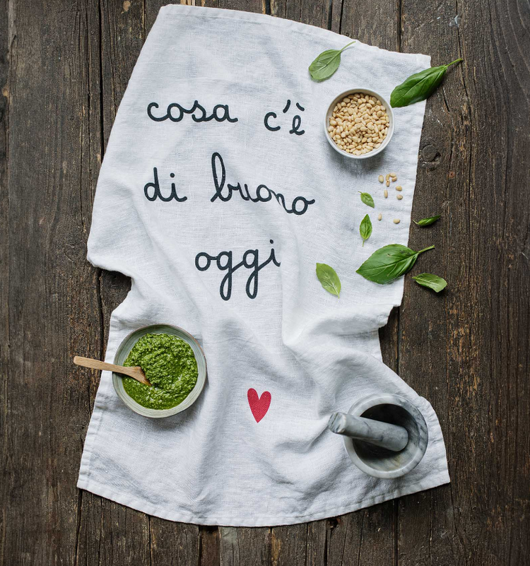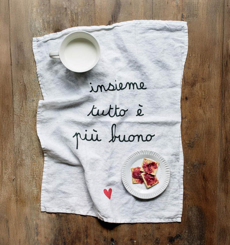 Strofinaccio in puro lino con cuore e dolce scritta , molto assorbente e il trattamento Stonewash conferisce l'effetto stropicciato e di morbidezza.