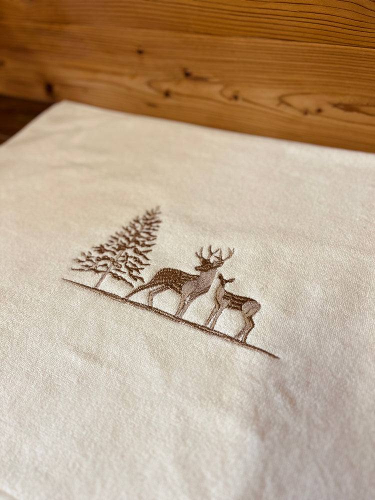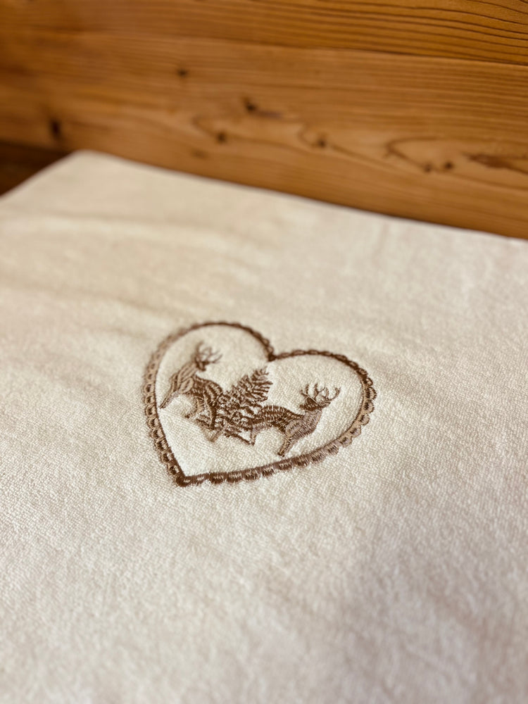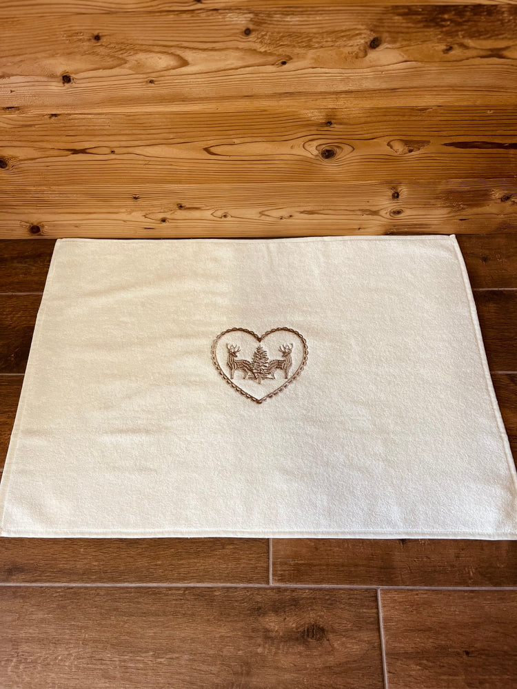 Tappeto da bagno bianco con ricami montani.