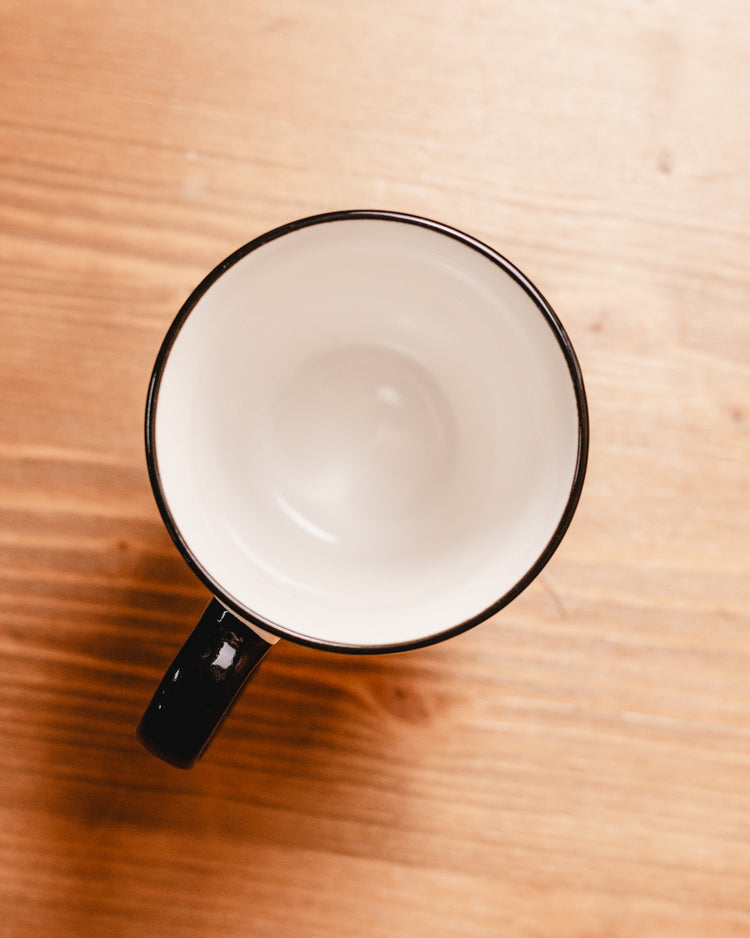 Tazza in ceramica bianca con disegni a contrasto nero.