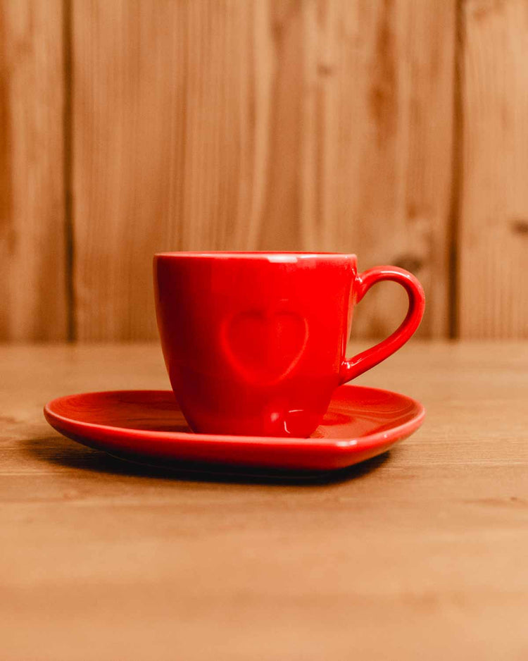 Tazzina da caffè con piattino a forma di cuore con cuoricini sotto e sopra