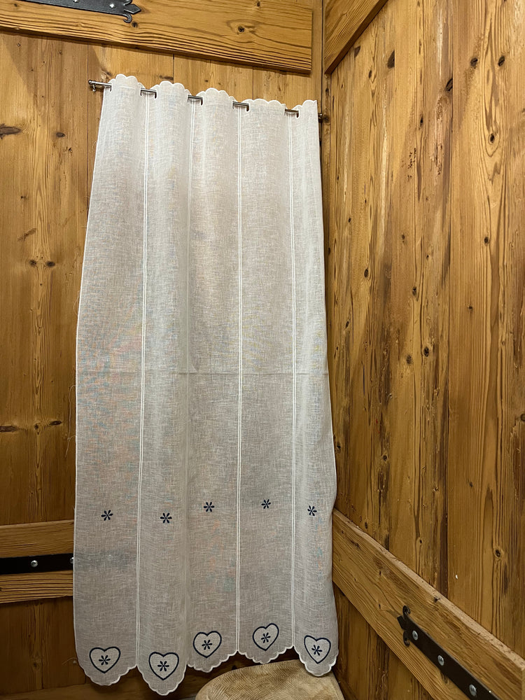 Tendina a vetro con cuoricino ricamato color blu e fiorellino stilizzato.