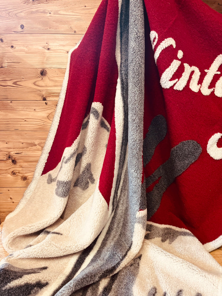 Coperta in lana bollita con sci, bastoncini e montagne in rilievo.