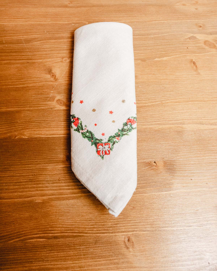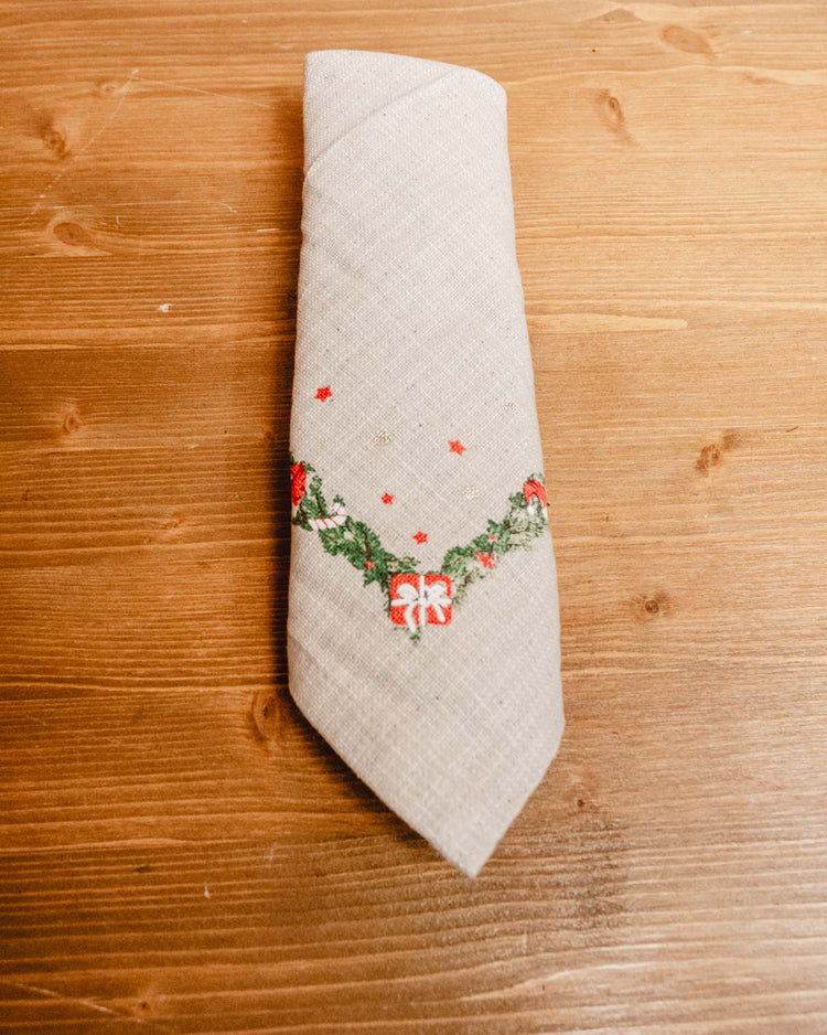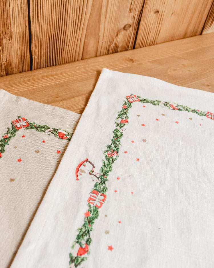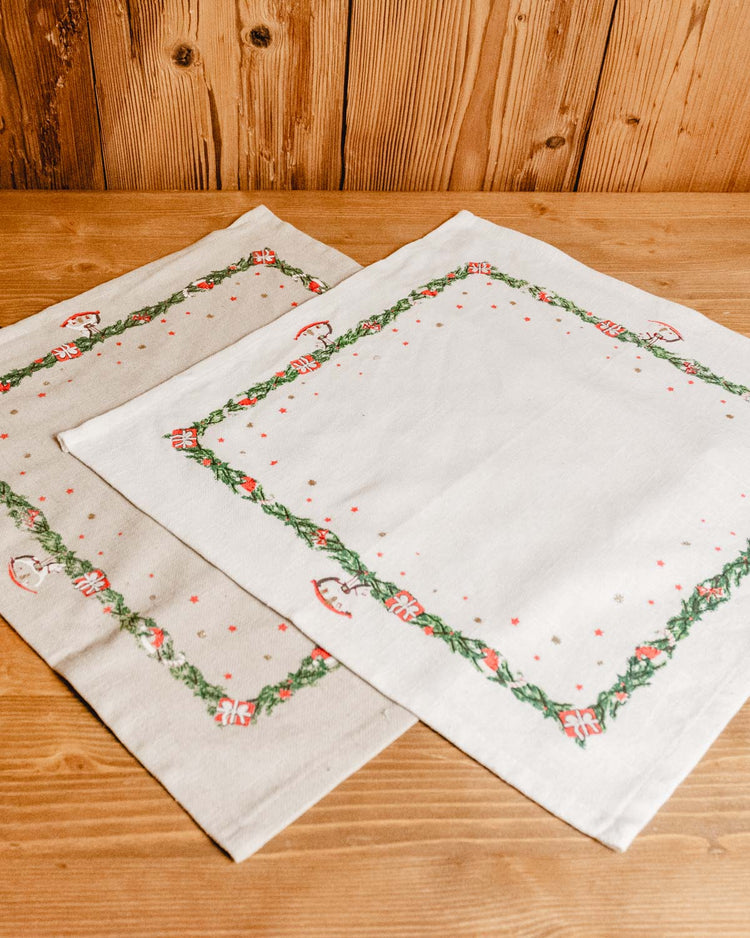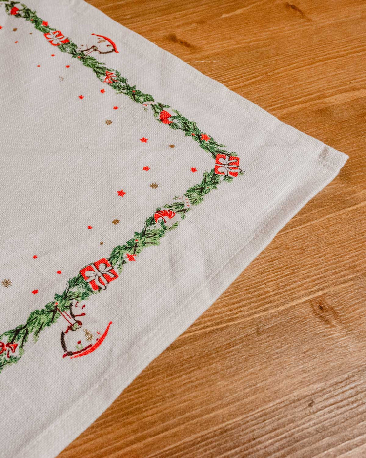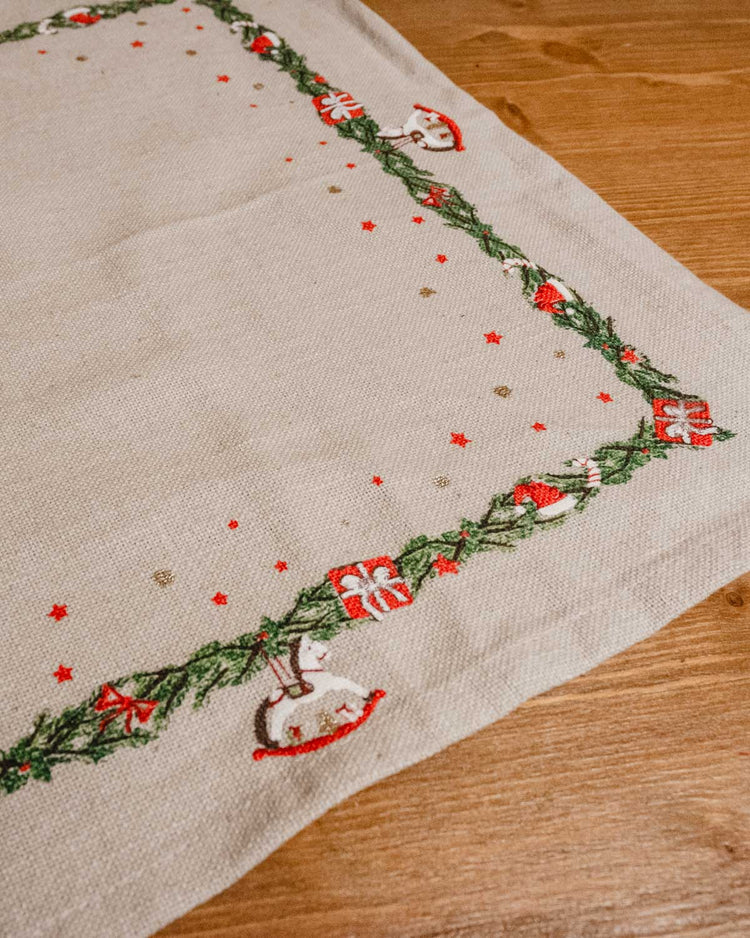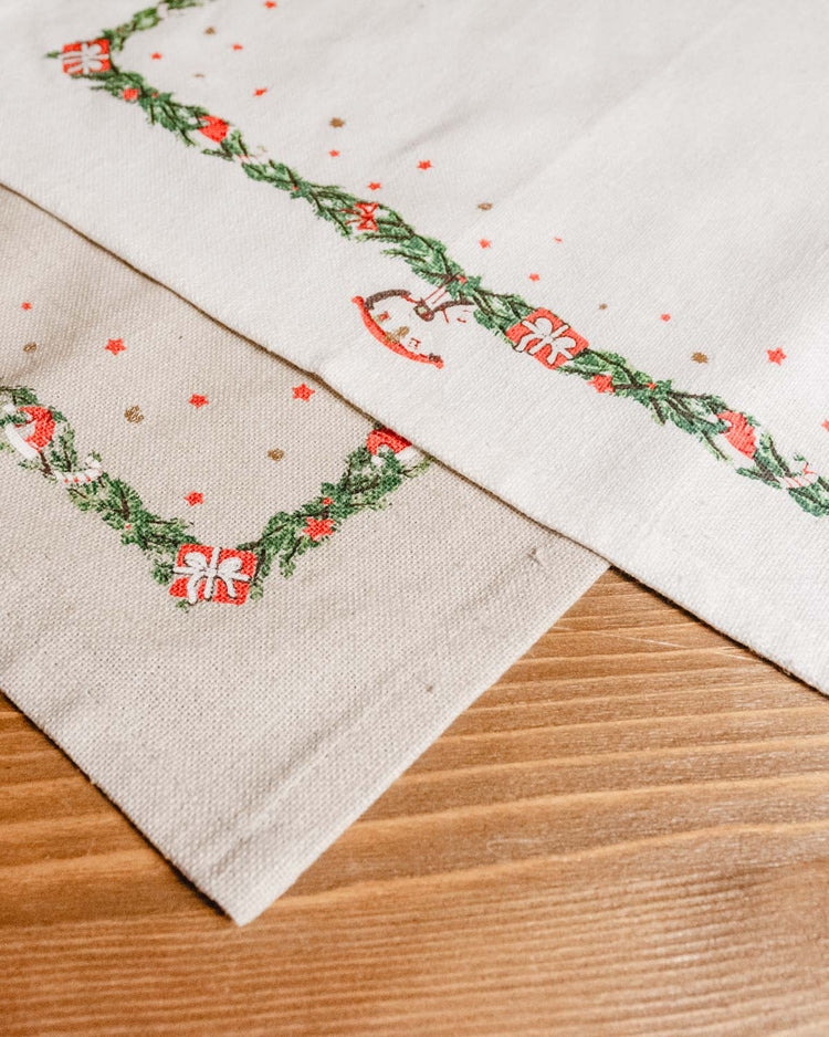 Tovagliolo in cotone effetto "grezzo" con ghirlanda addobbata con pendoli. Motivo stampato.