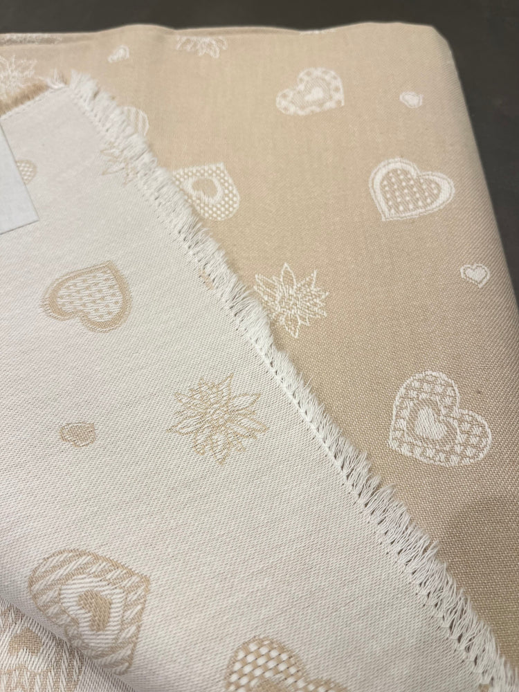Tovaglie con decoro cuori e stelle alpine super resistenti e durature nel tempo, in cotone antimacchia DOUBLE FACE realizzate in Alto Adige. Rifinite con punto saldo a zig-zag rendendo il bordo sfrangiato.