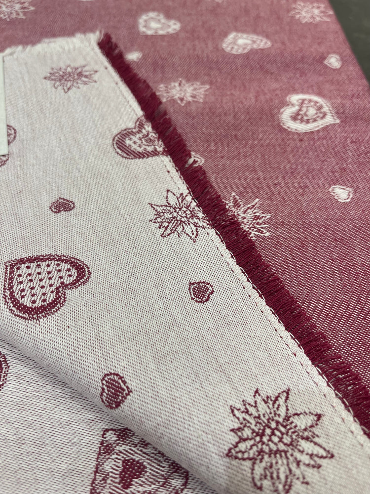 Tovaglie con decoro cuori e stelle alpine super resistenti e durature nel tempo, in cotone antimacchia DOUBLE FACE realizzate in Alto Adige. Rifinite con punto saldo a zig-zag rendendo il bordo sfrangiato.
