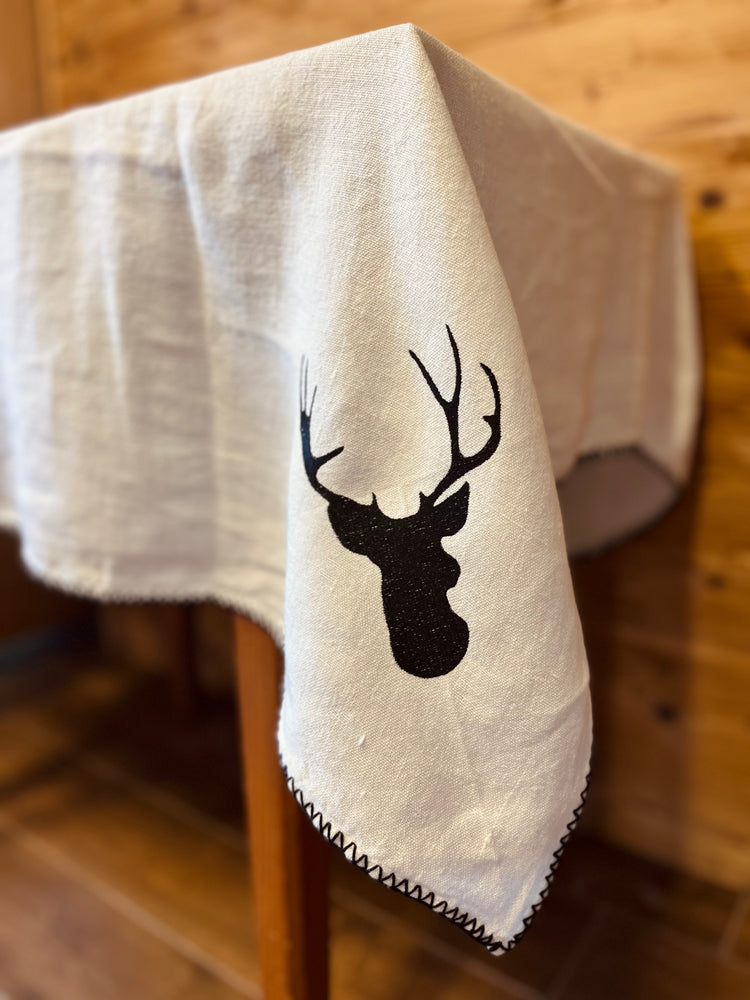 Tovaglia in lino tinta unita con bordo perimetrale "a conchiglia" e resa unica ed inimitabile dai cervi ricamati in contrasto negli angoli.
