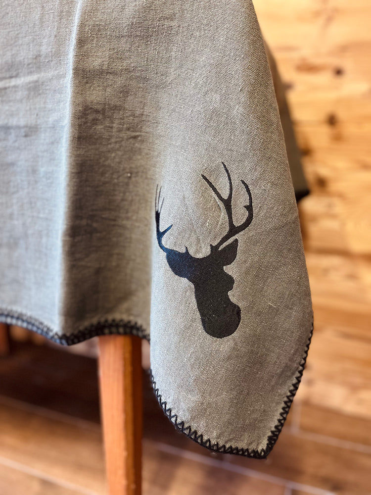 Tovaglia in lino tinta unita con bordo perimetrale "a conchiglia" e resa unica ed inimitabile dai cervi ricamati in contrasto negli angoli.