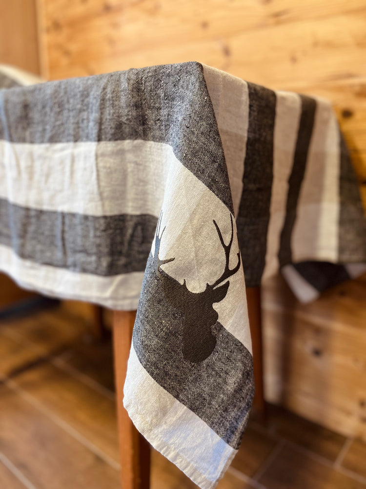 Tovaglia in lino con motivo quadrettoni sui toni del grigio e beige resa unica ed inimitabile dai cervi ricamati in contrasto negli angoli.