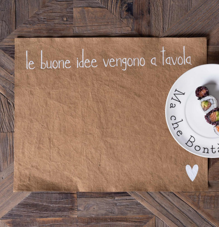 Tovaglietta in Cellulosa eco-sostenibile e riciclabile con scritta e cuoricino bianco. Ideale per apparecchiare velocemente e proteggendo la superficie sottostante. Dona inoltre un tocco di originalità alla tua casa!