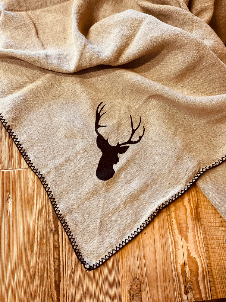 Tovaglia in lino tinta unita con bordo perimetrale "a conchiglia" e resa unica ed inimitabile dai cervi ricamati in contrasto negli angoli.