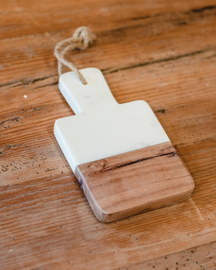 Tagliere piccolo rettangolare, con laccetto in corda per poterlo appendere.