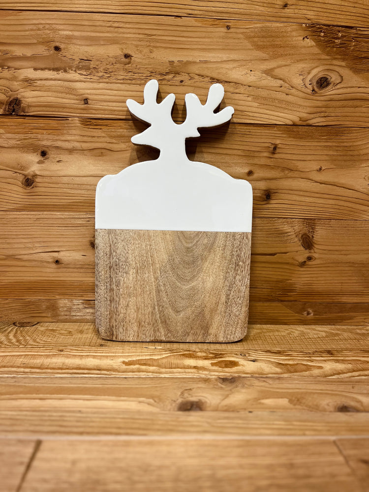 Vassoietto in legno con, nella parte sopra, la testa dei cervo stilizzata dipinta con vernice bianca stilizzata.
