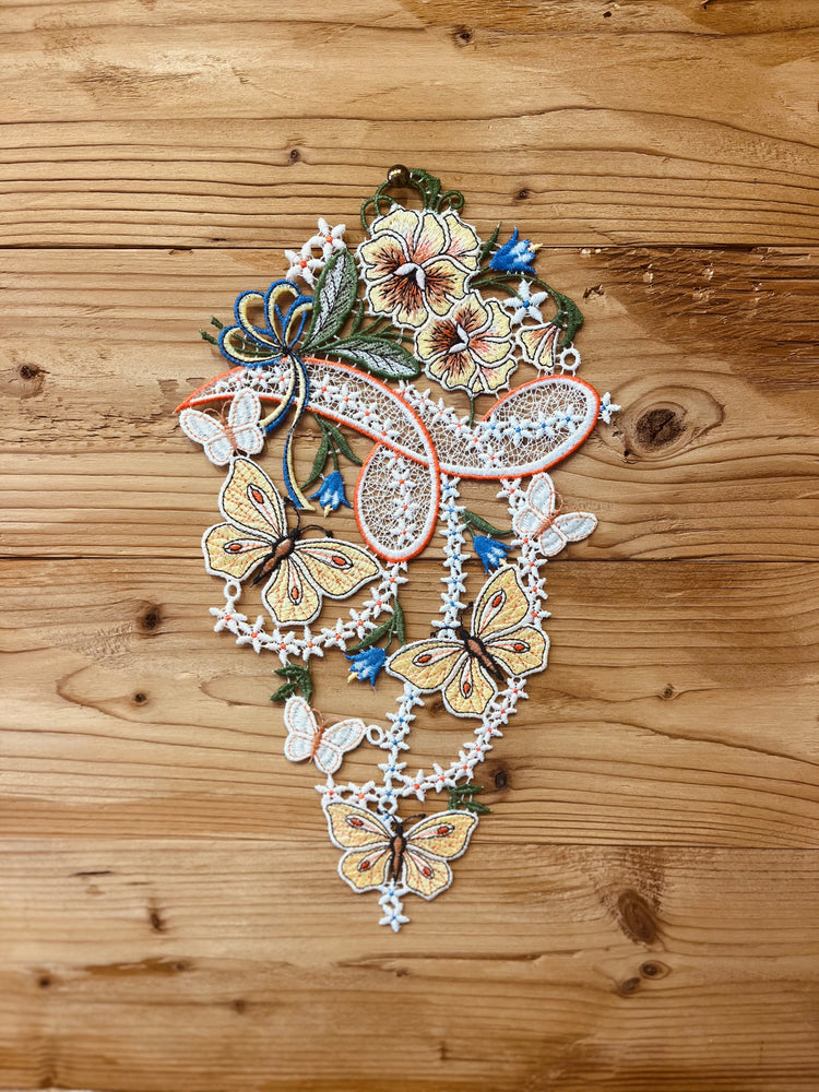 Decoro in pizzo semi rigido da attaccare ai vetri delle finestre con asola per poter infilare la ventosa.