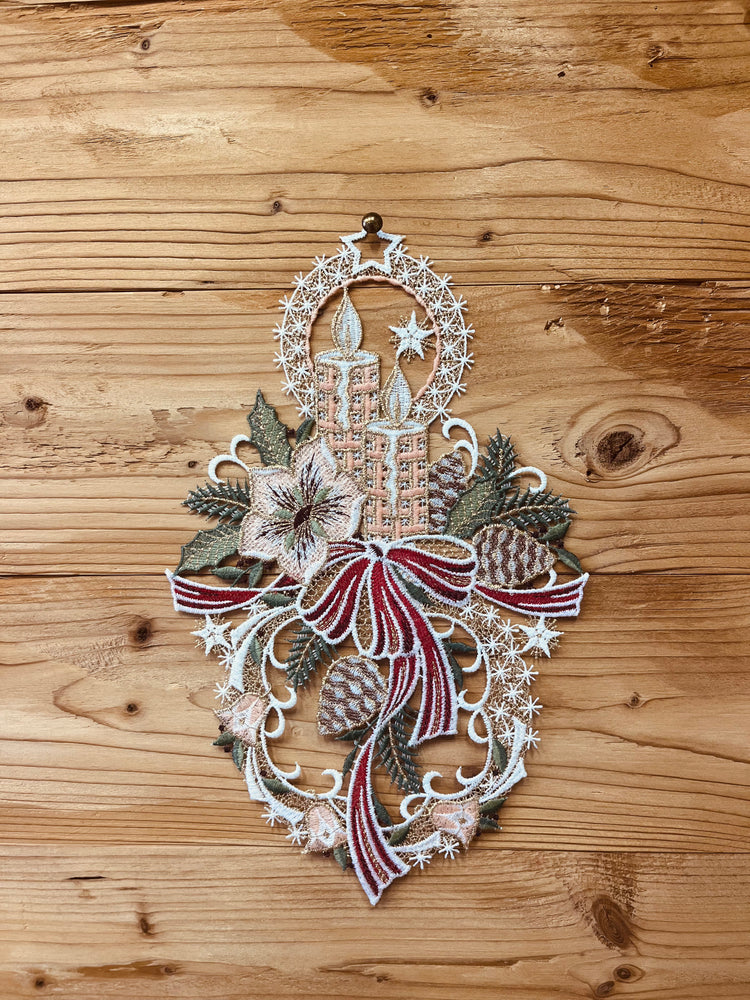 Decoro in pizzo semi rigido da attaccare ai vetri delle finestre con asola per poter infilare la ventosa.