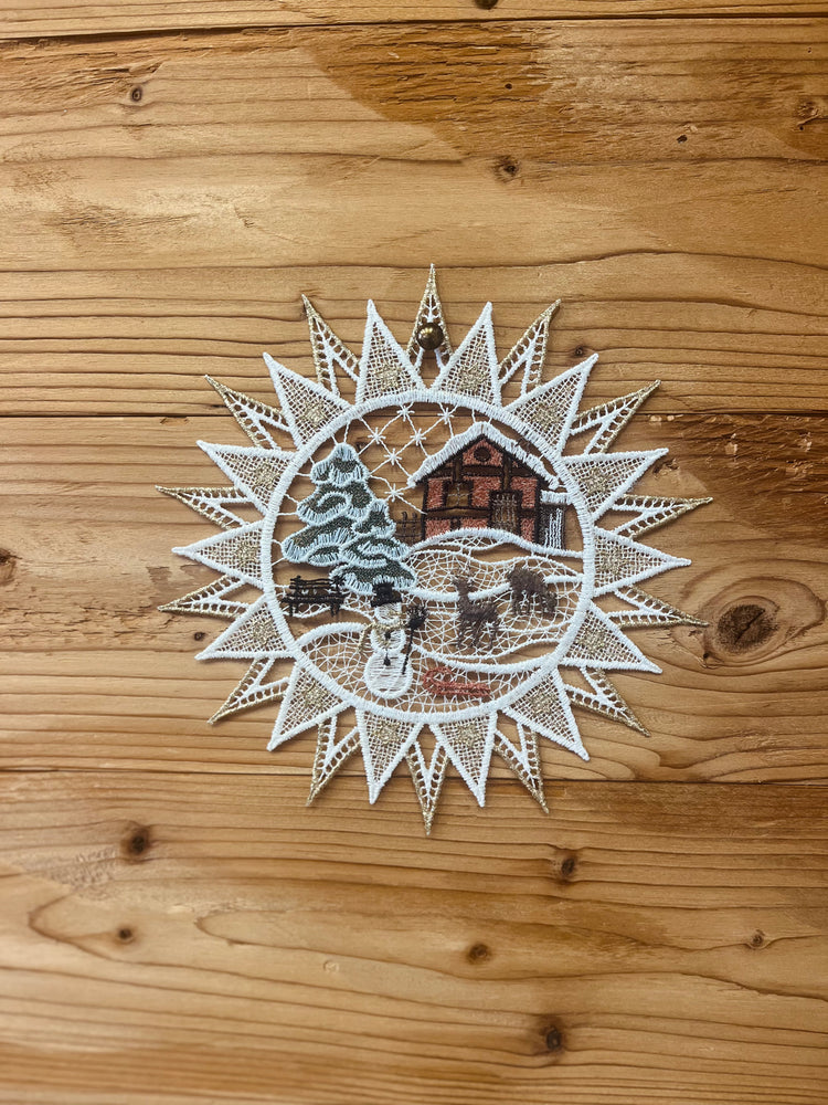 Decoro in pizzo semi rigido da attaccare ai vetri delle finestre con asola per poter infilare la ventosa.