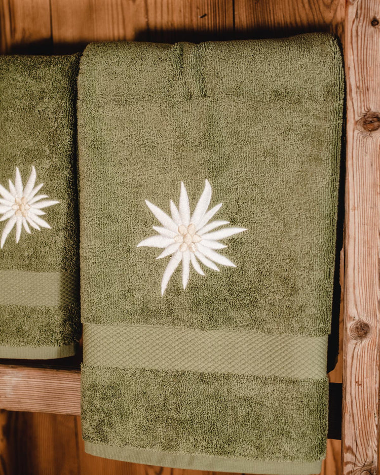 Asciugamani in morbido cotone con stelle alpine ricamate in contrasto. Dona al tuo bagno un tocco di simpatia senza rinunciare alla qualità.