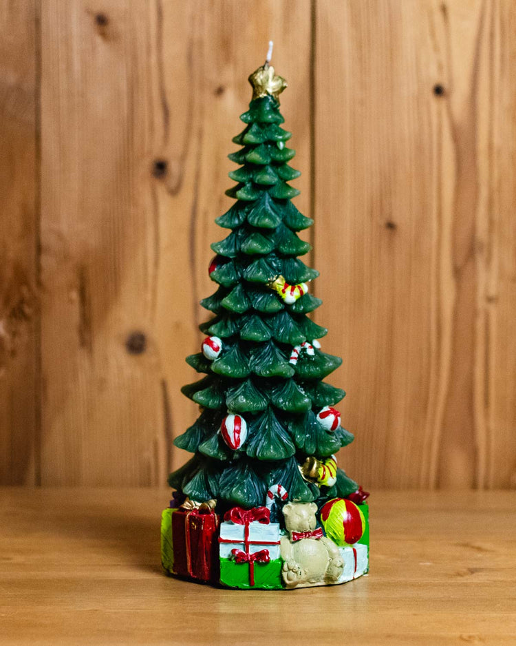 Simpatiche candele a forma di albero con globi, regali, orsetti e stella in punta.