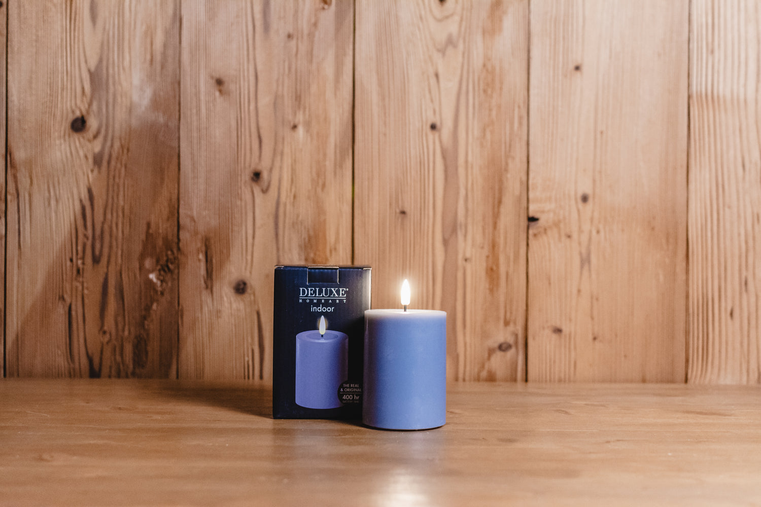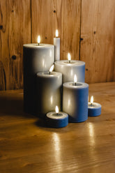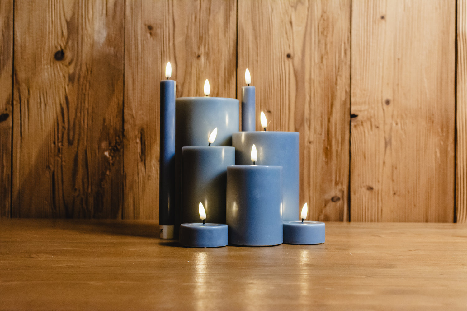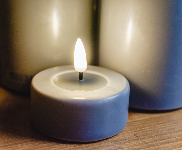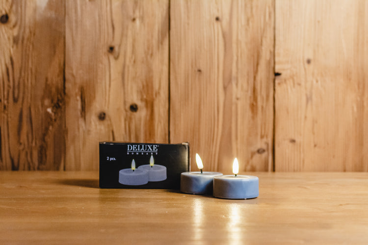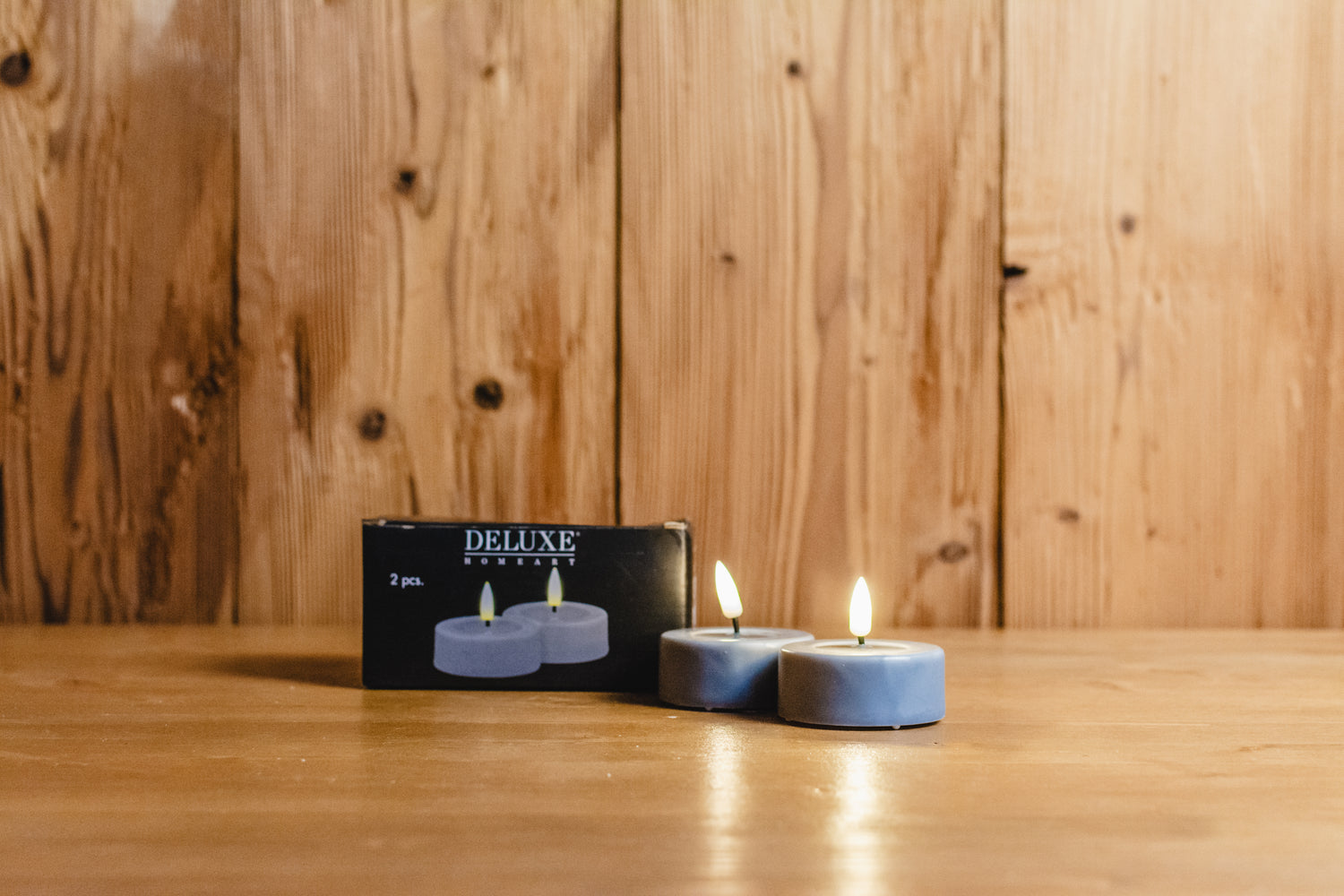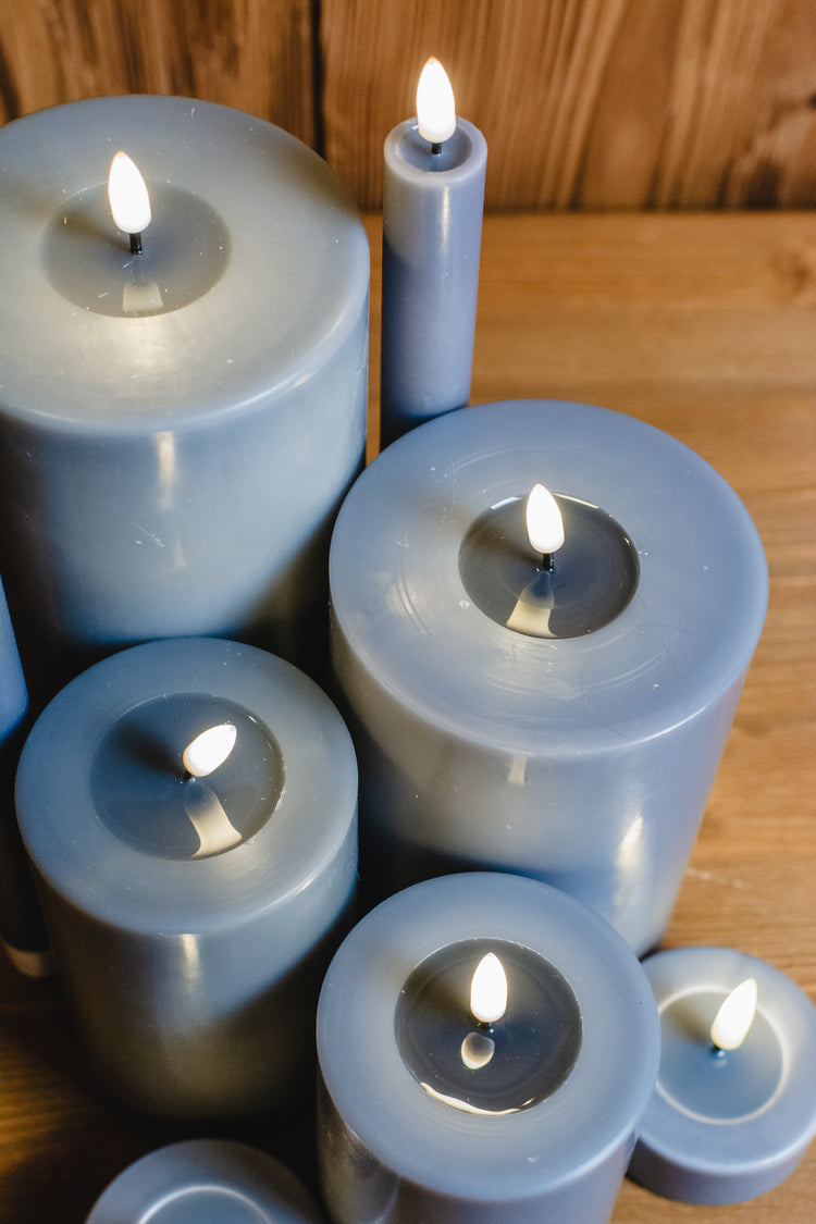 Candele elettriche color grigio con anima in plastica e rivestite di cera, la fiammella fa l'effetto del fuoco per renderla in più reale possibile.
