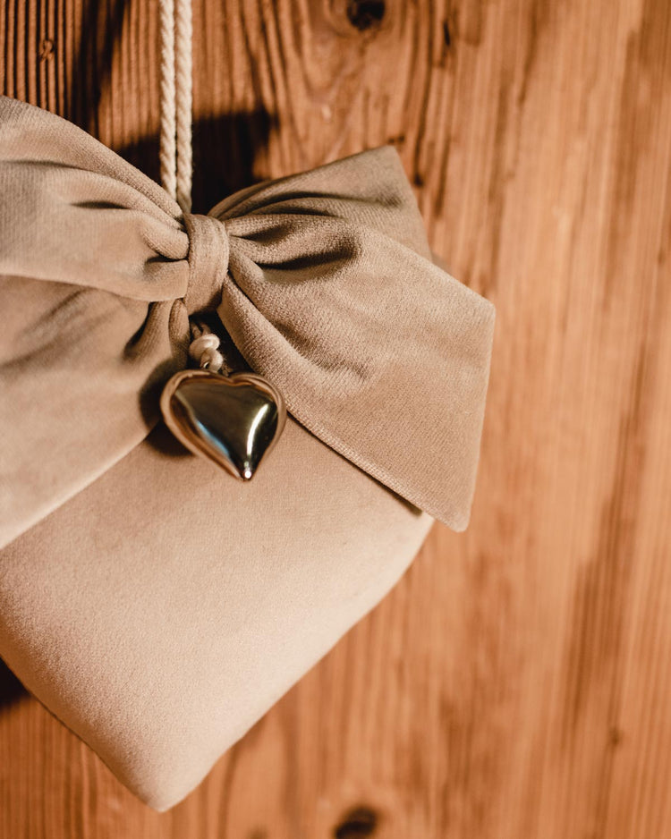 Cuoricino in velluto rifinito con fiocchetto e ciondolo.