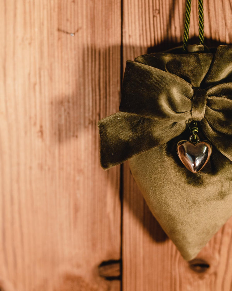 Cuoricino in velluto imbottito con perle profumate e rifinito con fiocchetto e ciondolo.