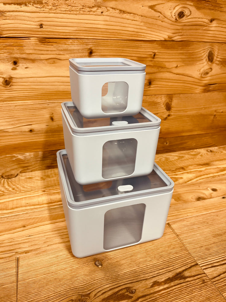 Set da 3 pezzi Coordinati e assolutamente di tendenza, i nuovi colorati barattoli Quadro sono preziosi alleati dell’ordine in cucina, in grado di sfruttare lo spazio in verticale grazie alla perfetta sovrapponibilità e creare posto da vuoti per la possibilità di essere riposti a matrioska nelle tre diverse misure.