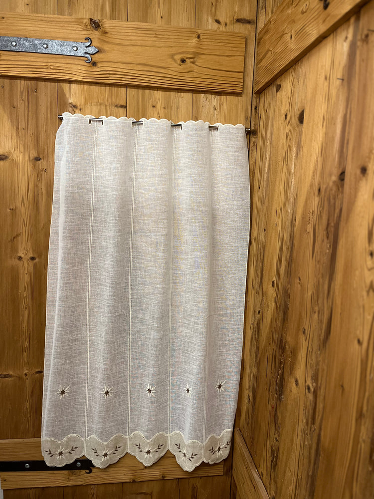 Tendina a vetro con grazioso decoro finale in contrasto con foglie e stelle alpine. Stella alpina ricamata anche nel centro della tendina.